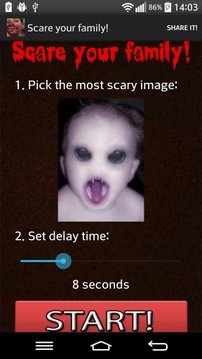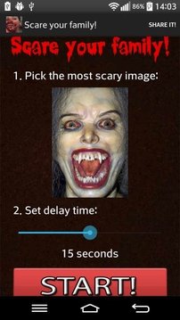 吓到你的家人-安卓系统是一个可怕的和免费的工具 !它是市场上最可怕的应用程序 !如果你想要吓朋友或恫吓的家人 — — 这款软件是为你 !这个免费的笑话是关于谷歌播放最可怕的恶作剧 !这可以令每个人都很害怕 !它包含 10 可怕的景象 !你必须选择最可怕的图像并设置延迟时间。然后给一个朋友的电话。电话会工作正常,但后选定的时间还有可怕的惊喜 !可怕的图像就会弹出来,以及将播放可怕的尖叫声 !每个人都会害怕到 deatch !免费吓唬女朋友或女孩 !这个可怕的笑话是免费的 !你可以吓唬大家免费 !如何使用恐吓家族-可怕的玩笑?1.设置最可怕图片 2。设置延迟时间 3。给一个朋友的电话 !在选定的时间后将显示的可怕形象 ; 以及将播放恐怖的尖叫 !你的朋友会害怕 !吓朋友、 恫吓的家人和免费吓女友,这可怕的玩笑 !