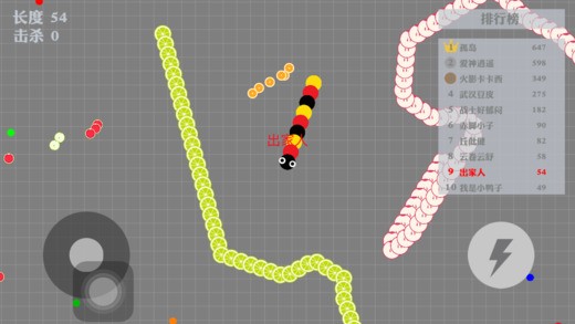小心!蛇头碰到其他贪吃蛇就会死亡,并且产生大量小圆点。