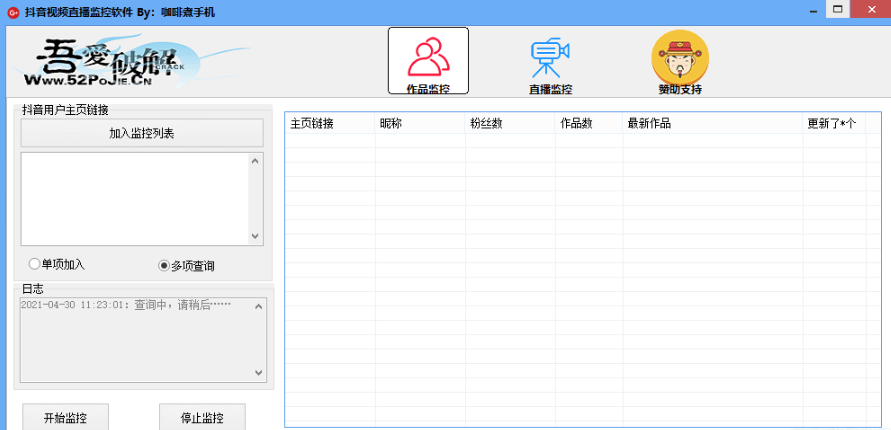 抖音视频直播监控软件需要您将抖音用户的主页链接添加到监控列表内,添加之后,您可以在该软件右侧的列表中查看主页链接对应的昵称、粉丝数、作品数等,确认是否正确。之后,便可以快速查询指定用户的作品更新数量与直播间状态了。