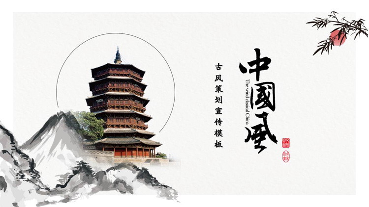 颜色浅淡,大面积使用灰色,显得更古典,整体看上去更显素净,不显得花哨,呈现出的视觉效果更佳,整体看上去更美观,看着更顺眼。水墨群山宝塔背景的古典中国风PPT模板使用宝塔作为背景图片,显得更大气,在端庄之中带有一丝巍峨,整体看上去更有气势。