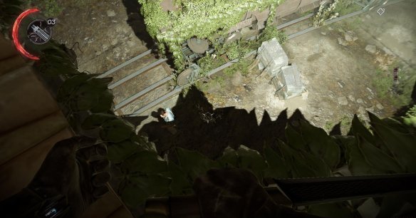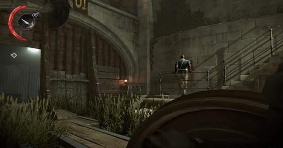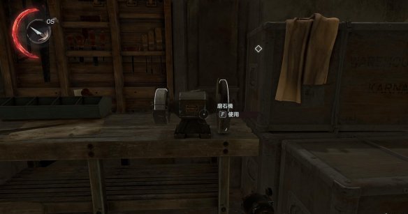 打开边上的铁门,在楼梯口看到有两个守卫。进入左边仓库内,使用磨石机将其中一个守卫引到下方,跳下去击晕,趁仍在楼梯口的守卫背对时悄悄过去击晕。