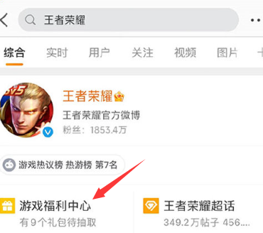 1、微博搜索【王者荣耀】,点击下方的游戏福利中心或点击https://m.weibo.cn/c/wbox?id=oqu4f90a1b&aid=1073&fw=feed