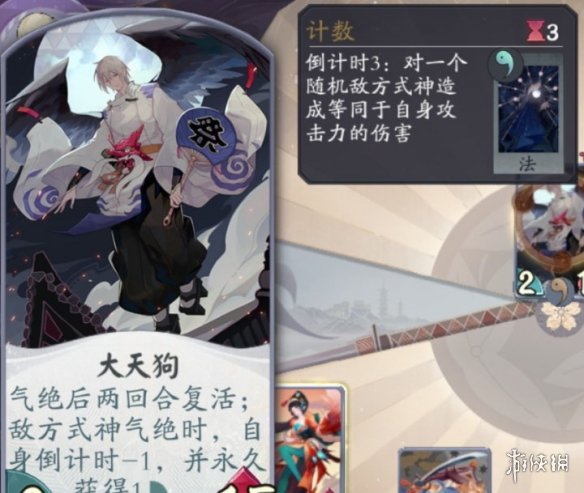 上文提到大天狗比一般式神少1回合的气绝待机时间,这会使他更快的回到战场,气绝他的收益变低,但大天狗的初期攻击力较差,所以我们可以利用这点在前中期放弃进攻选择养狗策略,放开战斗区让大天狗直接攻击我方玩家,从而获得更多时间培养犬神,并在选择2勾玉回合进行爆发。