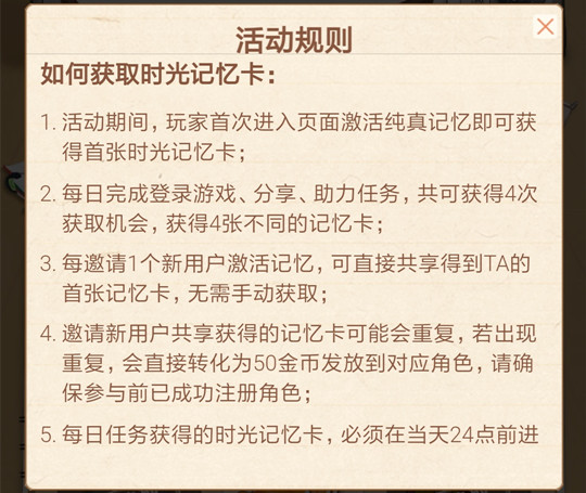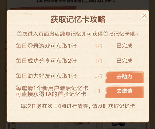 其中需要注意的是时光记忆卡的获取方法,其中分享、助力以及邀请好友激活都可以点击“邀请同龄小伙伴”进行分享: