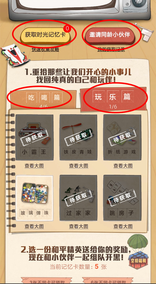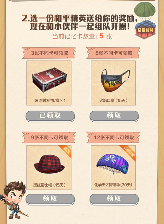 然后每天活动的时光记忆卡都是不相同的,而要领取到化学天才降落伞需要12张不同的时光记忆卡才能领取,也就是说需要集齐吃喝篇与玩乐篇就可以领取了。