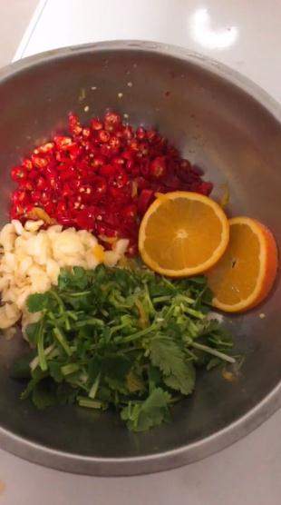 辣鸡,蒜,香菜,橙子,酱油,白醋,盐,白糖,加水;