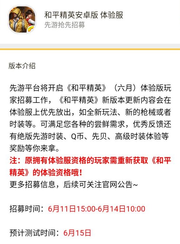 据了解,《和平精英》体验服已经开放了6月新版本的资格申请,并预计在6月15号开放《和平精英》的体验服。
