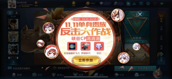 【11.11单身贵族反击大作战】活动已开启!峡谷 CP消消消,11月11日至11月15日,登录游戏,参与活动,专属永久旺德福播报和海量英雄碎片等你来拿!