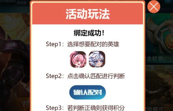 活动流程:登录游戏,通过活动面板进入活动页面,进行峡谷英雄消除游戏,完成活动任务可获得对应消除机会,成功使用机会匹配消除CP英雄即可获得积分兑换奖励;