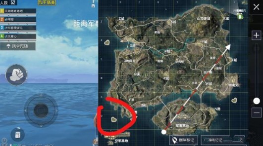 上图便是来自于《和平精英》夏日模式里的海岛地图,红圈的位置便是一个心形岛了!除了这个位置之外,在海岛地图的四个边侧里坐落着其余的心形岛,上图中的队伍玩家此时就在右上侧的心形岛等待飞机呢!除了刚说的气球彩蛋之外呢,这里还会随机的出现一种豪华邮轮。