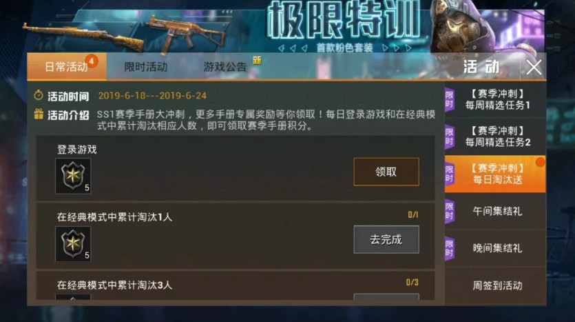 6月18日0:00至6月24日23:59,每日登录游戏和在经典模式中累计淘汰相应人数,即可领取赛季手册积分*40,七天总计可以获得赛季积分*280。