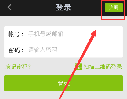 4、在“登录”界面上,点击右上角的“注册”按钮。(也可以使用其他方式登录)