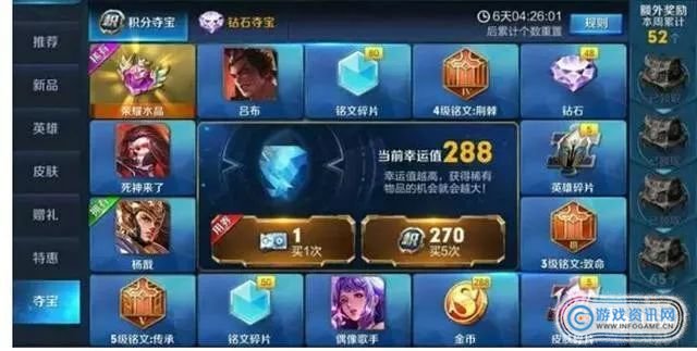 积分夺宝这个活动的抽中奖的几率很低,属于那种越来越高的中奖率。这位玩家的小号是一次都没有抽过的,他的幸运值也是0,只想试一试,没想到一次就抽中荣耀水晶。