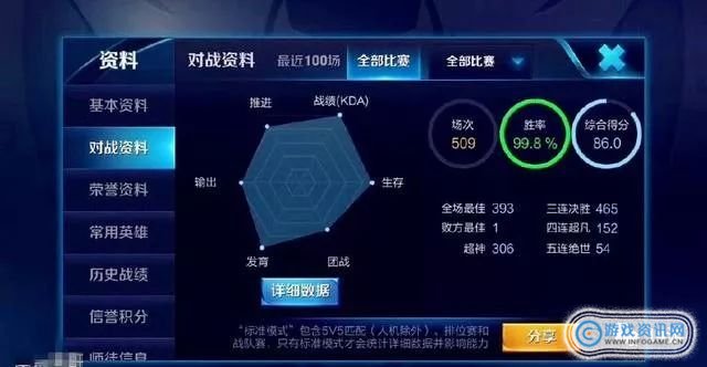 看到这张图相信大部分小伙伴都很惊讶吧?这位国服最强玩家509场比赛胜率是99.8%,差不多就是100%胜率。而且这位玩家509场比赛中就拿了393场MVP,这才是国服最强玩家啊。另外一点就是,我们知道,五杀是非常困难的,但是这位玩家却拿了54个五杀,真是令人佩服不已。
