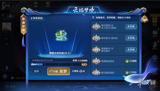 激活普通/高级梦境后,完成每日任务会获得星光,消耗星光就可以为梦境充能,筑梦还有一定概率暴击,让梦境能量成长翻倍。