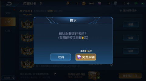 各位召唤师每周将有6次刷新次数,其中仅部分任务可刷新,所有可刷新任务共用次数。每周首次刷新将免费,第二次消耗30钻石,后续每次刷新任务均消耗50钻石,所有刷新次数消耗完毕后,刷新按钮将消失。