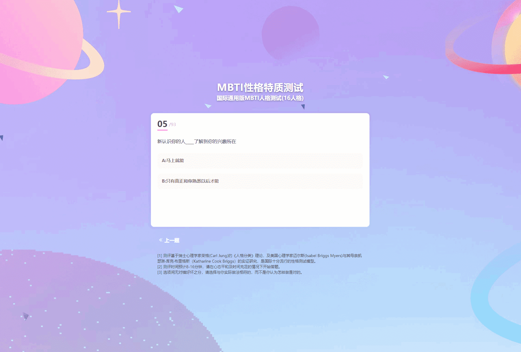 sbti 人格测试涵盖了多个维度,从性格特质到行为模式,从兴趣爱好到价值观念,全方位地剖析一个人的人格。它通过一系列精心设计的问题,引导测试者展现出真实的自我。比如,在性格方面,会考察你是外向还是内向,是情绪稳定型还是情绪敏感型等;在行为模式上,会探究你面对压力时的应对方式,是积极主动解决还是消极逃避等。这些丰富的内容能让你对自己有一个立体的认识。