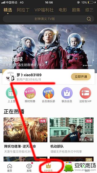 1、进入优酷App之后点击底部中间的【VIP会员】,然后再点击自己的用户头像的位置进入VIP中心;