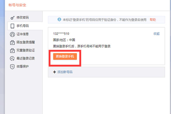 8、点击进入“更换登录手机”。