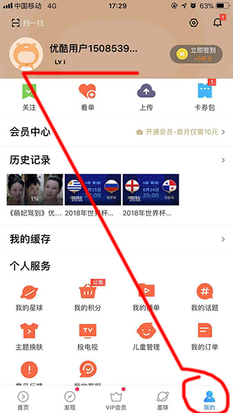 1、首先打开手机优酷,然后选择底部【我的】,再点击顶部的头像