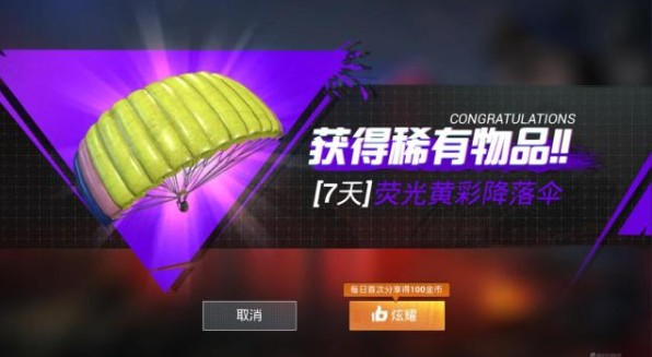 因为,打开邀请函以后,我们并没有获得太过稀有的奖励,只是获得了一个7天的荧光黄彩降落伞。