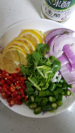 准备食材,柠檬切片去籽。洋葱切块,小米椒和螺丝椒以及香菜切好放碗里