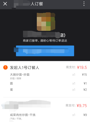 等到订餐发起人那边确认订单并付款后,再点击进入就可以看到每个人应该要承担的费用了。