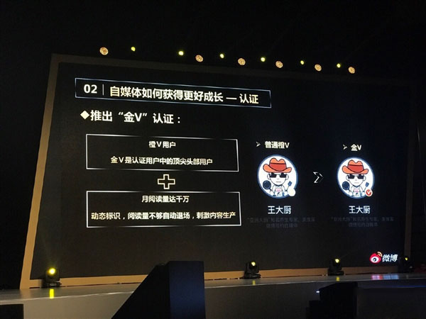 介绍,“金V”是橙V用户中的顶尖用户,要求是已认证的微博签约自媒体,并且每月阅读量达到1000W,如果达不到,金v标识就会消失。