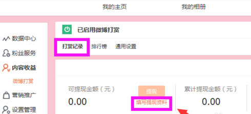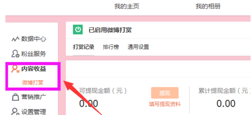 3.进入“管理中心”页面,点击“内容收益”。在其下方随即会出现“微博打赏”,点击“微博打赏”。