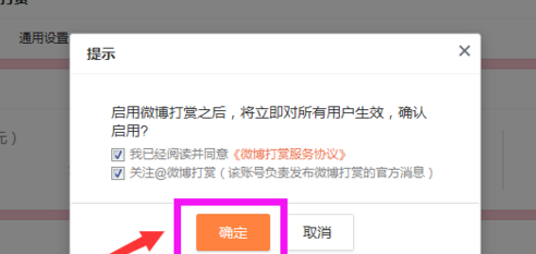 5.显示提示信息:启用微博打赏之后,将立即对所有用户生效,确认启用?点击"确定"。