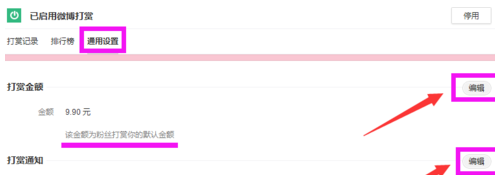 9.启用微博打赏后,在"通用设置"里,默认粉丝给你打赏的金额是9.9元,可以点击编辑打赏金额。也可以编辑打赏通知,粉丝打赏你后,会收到你发出的私信。