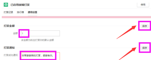 6.显示“已启用微博打赏”如果要停用微博打赏,点击右侧的“停用”即可。