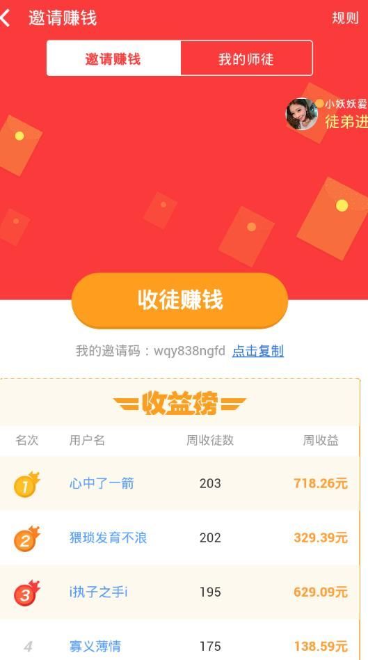 2、在收徒页面点击收徒赚钱,然后进行分享到各大网络中即可快速在线体验哟,同时用户在收徒后,徒弟应当在注册7天内的任意3天,每天向师傅成功进贡20金币,才能视为有效徒弟。而徒弟通过领视频红包、签到、做任务等途径获得10金币,系统会自动奖励师傅20金币,即进贡成功。