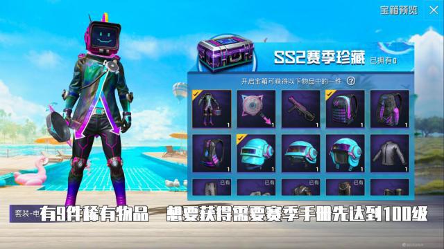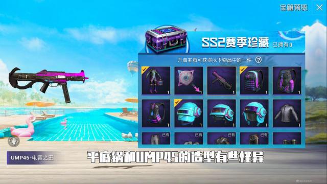 新增加的SS2赛季珍藏宝箱,一共包含9个稀有道具,和若干个普通道具。这9件稀有道具,分别是电音之王套装、平底锅皮肤、UMP45、以及3个背包的皮肤和3个头盔的皮肤。