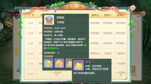 阵营战只会在每周六的20:00-20:55开放,时间非常的短,但是可以获得非常多的材料。除了大量的灵石之外还可以获得稀有的古董。