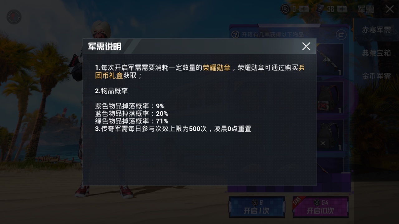 1.每次开启军需需要消耗一定数量的荣耀勋章,荣耀勋章可通过购买兵团币礼盒获取。
