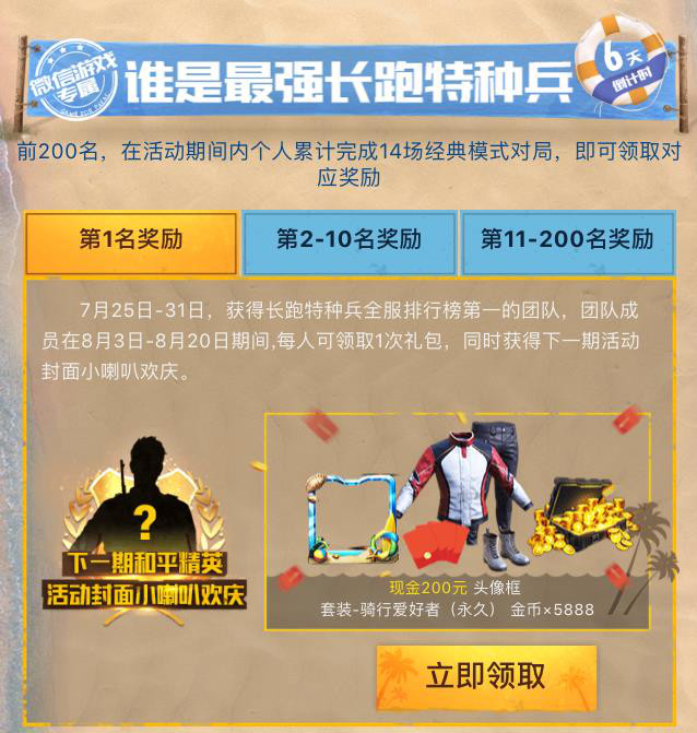 夏日趣味赛继续来袭!本期的主题是长跑特种兵!大家肯定都经历过,跑圈或转移位置时没有载具,只能跑步进圈的情况,而这次的比赛,各位特种兵们要邀请2到4个好友一起在比赛中组队一起奔跑!最能跑的队伍将获得惊喜大奖。
