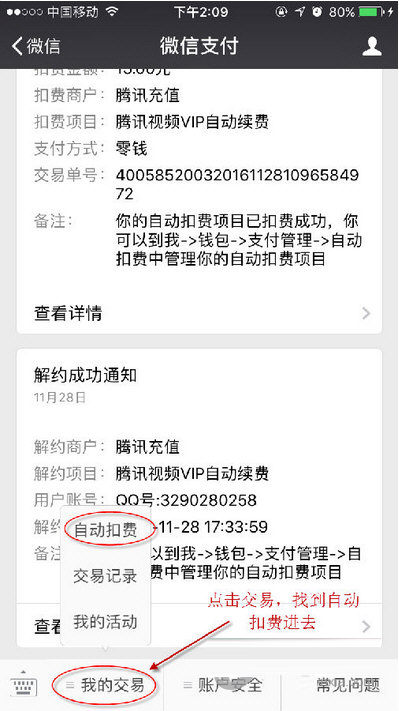 3、微信支付的频道里点击【我的交易】-然后选【自动扣费】