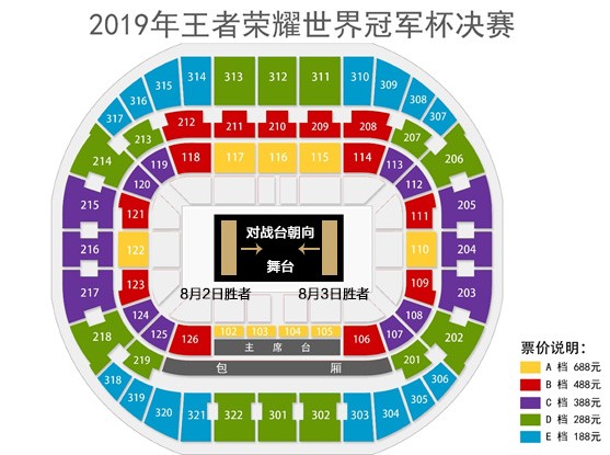 2019年王者荣耀世界冠军杯总决赛门票价格为:688元、488元、388元、288元、188元。