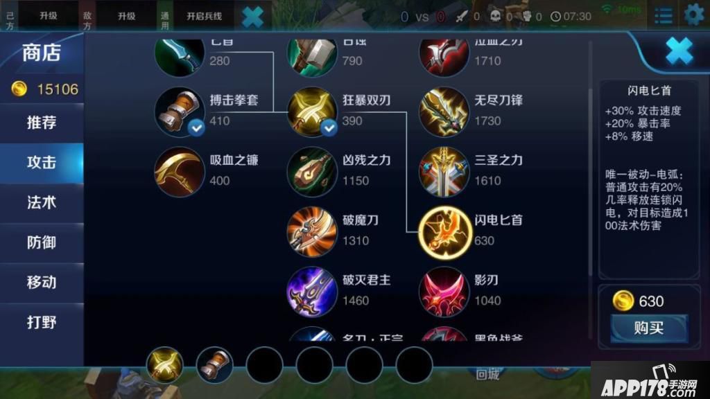 闪电匕首:+20%攻速 +20%暴击,普通攻击有30%几率释放连锁闪电,对目标造成(100+0.3*物攻)点法术伤害,这个伤害可以暴击