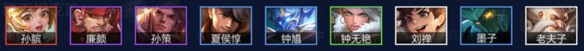 阵容成员:孙膑+廉颇+孙策+夏侯惇+钟馗+钟无艳+刘禅+墨子+老夫子