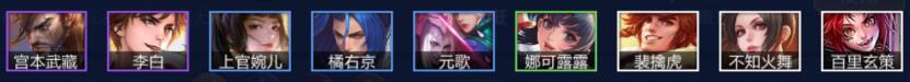阵容成员:宫本武藏+李白+上官婉儿+橘右京+元歌+娜可露露+裴勤虎+不知火舞+百里玄策