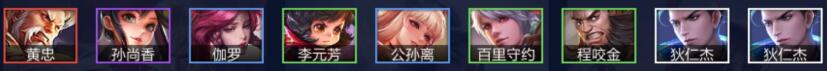 阵容成员:黄忠+孙尚香+伽罗+李元芳+公孙离+百里守约+程咬金+狄仁杰