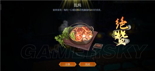 乱炖的配方是井水+肉+菜,这个要用炖锅,成本是1000金左右,每吃一口可以增加53点饱腹值和2点好感度!
