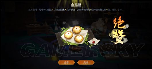金露酥需求燕窝+鸡蛋+面粉+糖+油,认真烤酥,1800金的成本,绝赞加成前吃一口可以增加77点饱腹值和6点好感。