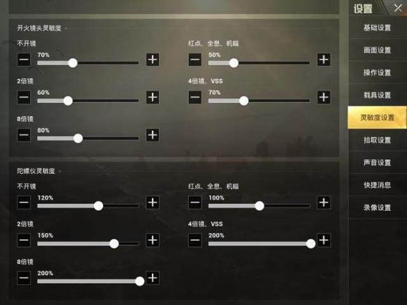 很多人可能会认为陀螺仪很烦,便关掉陀螺仪,其实,陀螺仪可以帮助压枪。如果开启陀螺仪,在开火的过程中,可以通过向下移动手机来压枪,但陀螺仪的能力是有限的,并不能完全代替手动压枪,图为陀螺仪灵敏度设置