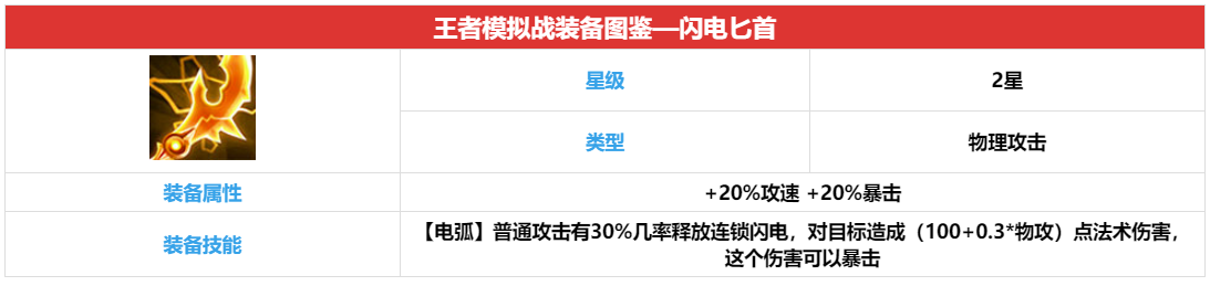 闪电匕首:+20%攻速+20%暴击;【电弧】:普通攻击有30%几率释放连锁闪电,对目标造成(100+0.3*物攻)点法术伤害,这个伤害可以暴击;