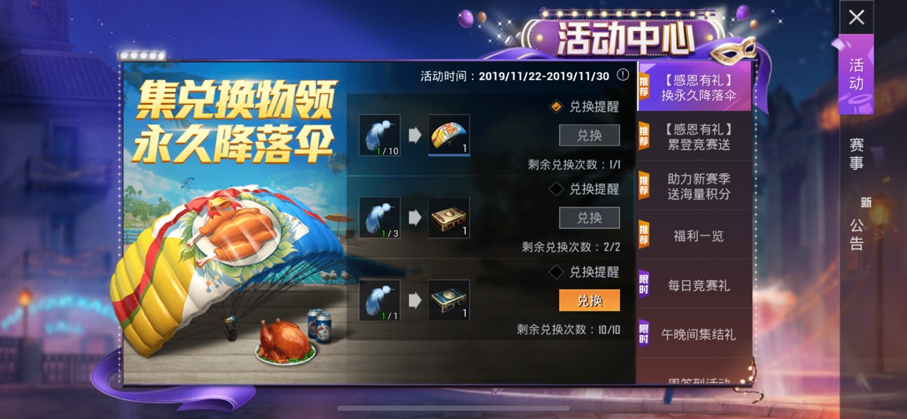 在活动期间,完成以下活跃任务,收集活动兑换物,换永久阳光火鸡降落伞: