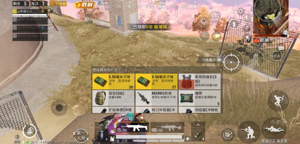 决赛圈边缘的房区最容易出人,靠近房区时我们必须蹲下移动,切换近战武器,认真听声音,进行全方位搜点,确定没人后,再通知队友进行全体转移。