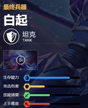 白起通过堆肉装能更有效的利用被技能,让白起在团战中更加坚挺,一战到底. | 白起唯一的输出技能,伤害不高,但CD较短,可以反复使用此技能进行消耗 | 群体控制技能,但缺点是距离短,出手时间长,先手很容易被躲开,但作为后手时,会较容易控制到敌方多人 | 控制技能,团战时冲到人群尽量嘲讽更多敌人形成控制效果,为友军创造输出条件 |